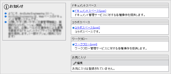 | [お気に入り]エリア | ログインしているユーザーが「お気に入り」として登録したURLがリンクとなって一覧表示されます。「お気に入り」を登録または編集する場合、[編集]ボタンをクリックします。