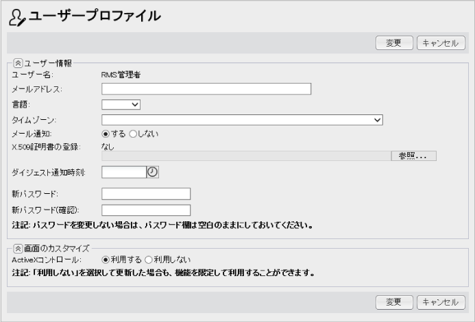 [メールアドレス]、[言語]、[タイムゾーン]、[メール通知]、[X.509証明書]、[ダイジェスト通知時刻]は、ポータル管理アプリケーションの設定によっては変更できない場合、または表示されない場合があります。
